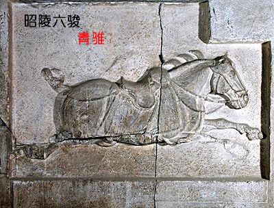 “青騅”為一匹蒼白雜色駿馬。據岑仲勉、葛承雍等先生考證有可能是來自西方“大秦”國的駿馬“青騅”之“青”不是泛指一種顏色而是來源于突厥文“cin”或“sin”在漢語中音寫為 “秦”“秦”、“青”同音故稱之。
