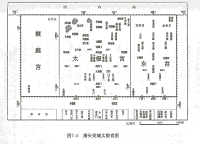 太極宮是初唐政事活動的中心,高祖、太宗在這里君臨天下,成就了一代圣制,“貞觀之治”政令皆由此地發出,貞觀君臣論政的許多著名故事也都發生在這里。高宗龍朔以后,政事活動中心東移大明宮,然中宗、睿宗、玄宗、僖宗與昭宗仍有部分時間在西內聽政,這里仍保留著唐代重要的政治中心地位。 |